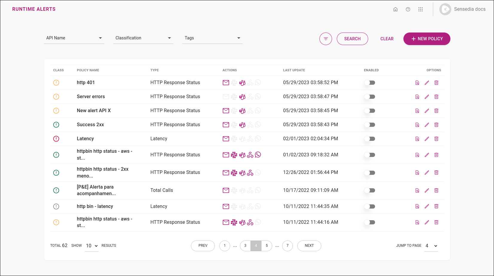 TIPIf you just want to disable notifications for an alert indefinitely, instead of removing the policy, you can use the enable/disable buttons in the ENABLED column of the Runtime Alerts page.