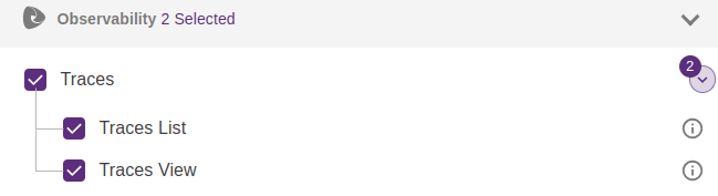 To enable trace viewing, your user must be associated with a role that has the Observability permission grouper selected along with the items below: