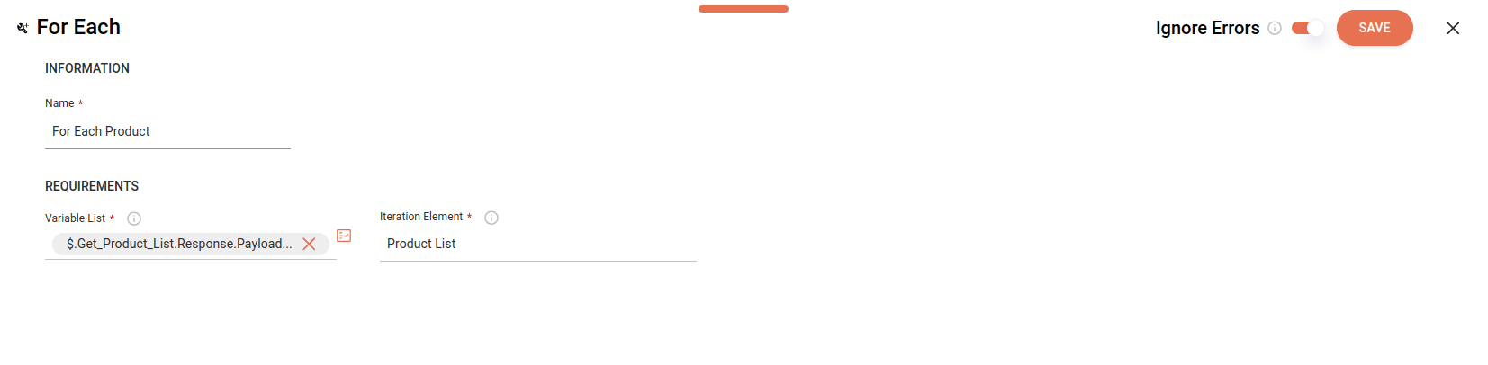 • Name: enter a unique name for For Each. This is an alphanumeric field that allows special characters and empty spaces, with a limit of 20 characters.
