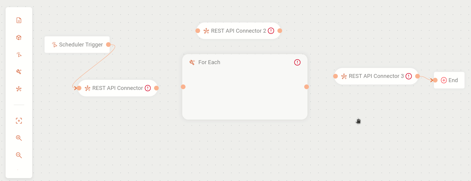 You can only have one subflow inside the For Each step, that is, it is not possible to execute parallel subflows inside For Each. If there are inactive steps, you will see a yellow alert icon on the step, informing that it is inactive and requires a connection to be executed.