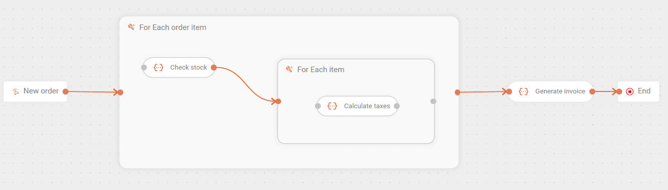 Consider the previous example of a flow with an order that contains multiple items (products). Imagine that each item is subject to the payment of two taxes.