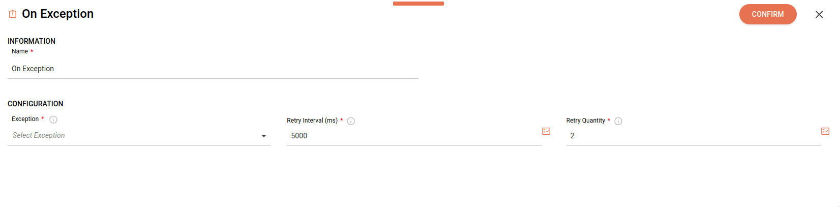 • Name: enter a unique name for the step. By default, you will see "On Exception". Alphanumeric field with a limit of 20 characters. Special characters and whitespace are not allowed.